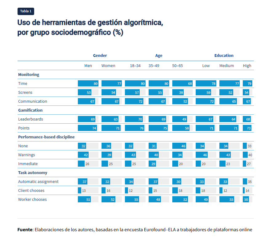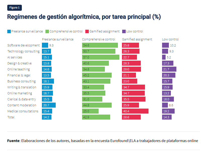 - Control exhaustivo: afecta al 43 % de los encuestados y es el régimen de gestión algorítmica más intensivo, ya que combina una alta vigilancia, sistemas de gamificación completos, autonomía limitada en las tareas mediante asignaciones automáticas o impulsadas por el cliente y medidas disciplinarias basadas en el rendimiento. Los trabajadores sujetos a este régimen experimentan todo el peso de la gestión algorítmica en todas sus dimensiones.