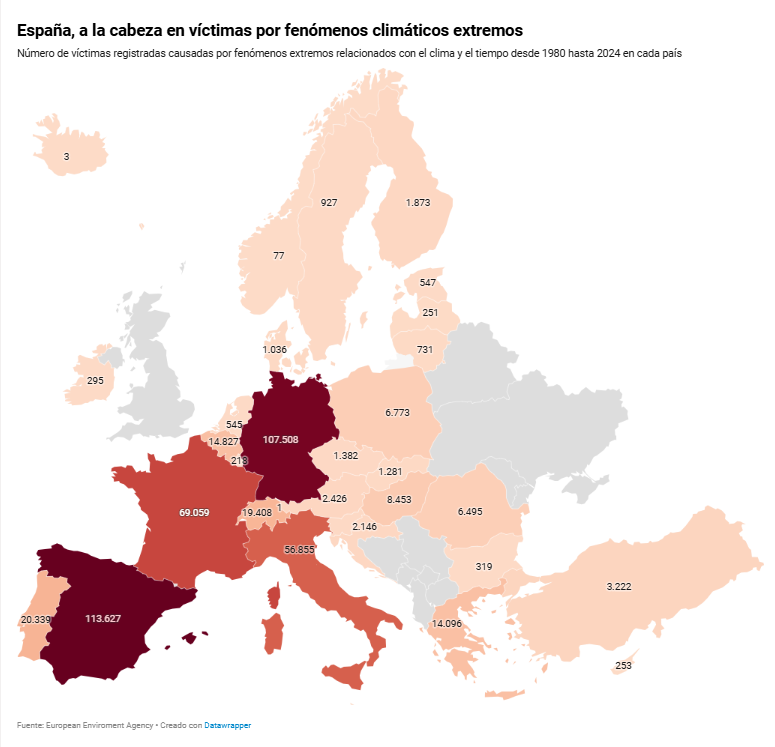 Aunque el Pacto Verde Europeo se resquebraje tanto en la UE como en España por las alianzas entre el PP y Vox, la realidad es tozuda: España es el país de la Unión Europea que soporta más fallecidos por fenómenos meteorológicos extremos. En los últimos 45 años suman más de 100.000 personas, según los datos de la Agencia Europea del Medio Ambiente (EEA).
