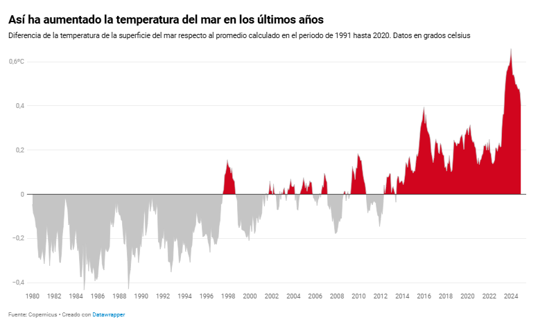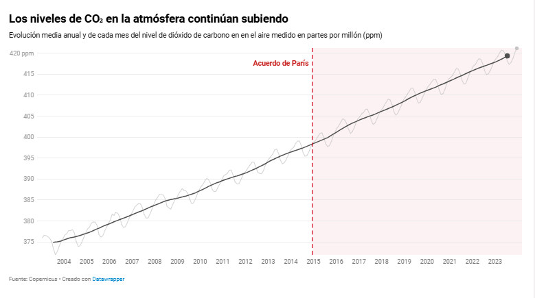 El director del servicio de cambio climático de Copernicus, Carlo Buontempo, recuerda que, justo en este momento, “el mundo está más recalentado que nunca” y que “cada año, desde 2015, se ha colocado entre los diez más calurosos registrados”. El incremento del calor global es consecuencia del efecto invernadero que genera el CO₂ (y otros gases) acumulado en la atmósfera por el uso intensivo de hidrocarburos.