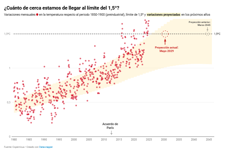 El siguiente gráfico enseña la escalada de la temperatura global hacia el límite máximo acordado por los países en el Acuerdo de París: 1,5ºC extra al final de siglo XXI. Cuando se cerró el Acuerdo de París ya se había alcanzado 1,04ºC de recalentamiento respecto a la época preindustrial y se proyectaba que el tope pactado se tocaría en 2042. Aunque ya ha habido superaciones de ese nivel, hoy se calcula que, a nivel global, ya estamos en +1,4ºC y que ese valor objetivo puede llegar en 2029. La situación se ha acelerado.