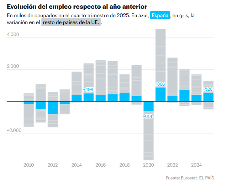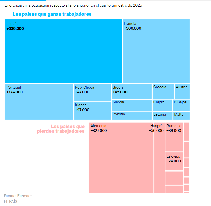 La economía española avanza con fuerza, tanta como para ser el mercado laboral de la Unión Europa que más nuevos empleos logró en 2025. Fueron 526.000, cuatro de cada 10 creados en ese ejercicio, según los datos distribuidos el viernes pasado por Eurostat, la agencia estadística europea, pese a que es el cuarto país del club comunitario en población. Precisamente el más poblado, Alemania, es el que más puestos de trabajo perdió en el mismo periodo: del cuarto trimestre de 2024 al de 2025 se dejó 327.000 empleos por el camino. El bajón alemán es clave para entender el desempeño comunitario, que contando ganancias y pérdidas de empleo arroja un balance positivo de 790.000 puestos, el menor avance desde la crisis financiera, si se excluye el anómalo 2020 de la pandemia.