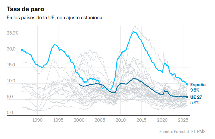 La ganancia de puestos de trabajo en España está reduciendo su tasa de paro, pero aún está entre los países con un peor desempeño en esta variable. El último dato disponible, de enero de 2026, indica que el paro español es del 9,8% [no se lograba bajar del 10% desde 2008], dos décimas por debajo de Finlandia. Tras 39 meses como el país con más proporción de desempleados de la UE, España se vio superada por el país escandinavo en la tasa de desempleo con ajuste estacional en noviembre del año pasado.