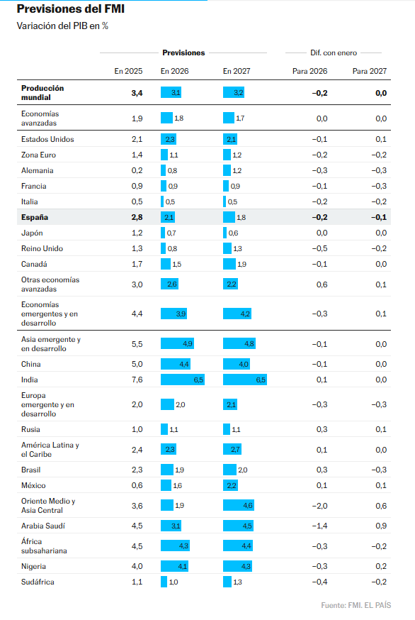 España no es inmune a las bombas en Oriente Próximo. La economía española se resentirá este año por el conflicto en el golfo: crecerá menos, creará menos empleo y tendrá más inflación que si no hubiera estallado la guerra, según certifica el último informe de Previsiones Económicas Mundiales (WEO, por sus siglas en inglés) difundido este martes por el Fondo Monetario Internacional (FMI).