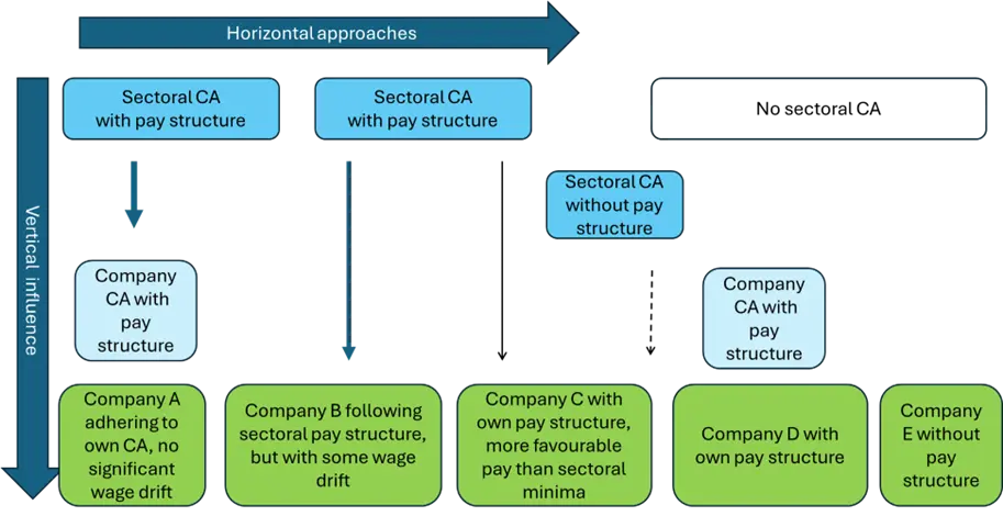 - Los convenios colectivos de nivel superior pueden proporcionar clasificaciones de puestos de trabajo y estructuras salariales neutras en cuanto al género para orientar la fijación de salarios de las empresas («influencia vertical»).4